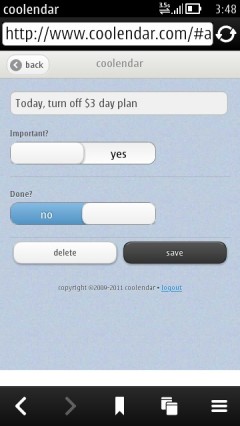 Although it’s not mentioned on Coolendar’s site, the web app is very mobile aware, the layout and logic adapt to work perfectly in the Android, Symbian and Opera Mobile browsers. It’s even functional, if a bit clunky (too large a font and lots of server round trips) in Opera Mini. I suspect it will work in just about any browser that has at least minimal JavaScript support.