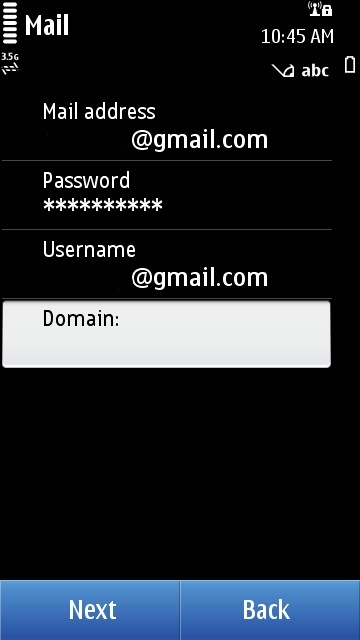 On the next screen (3rd image, above) enter your Gmail address in both the Mail address and Username fields and enter your password. Leave Domain blank and tap Next. If the same screen reappears, tap Next again.