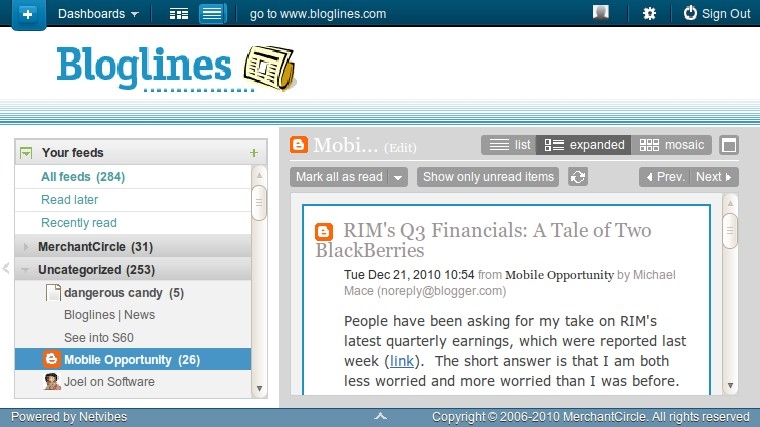 Bloglines has been dying a slow death ever since IAC bought it in 2005. Earlier this year IAC announced that they were going to shut down the service in September. After a couple extensions of the deadline Bloglines was “saved” when Merchant Circle , a social network for small businesses, acquired the brand. Initially we were told that nothing would change under the new ownership. Then early in December Merchant Circle let it be known that Mobile Bloglines, the only part of the service I used, was not going to be retained and that users would need to migrate their feeds from the “old” to the “new” Bloglines.