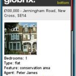 Globrix is a mobile Web service that claims “…to allow users to search nearly every property for sale or to rent in the UK.” I don’t know about that but it does have a lot of listings, 20,000 in London alone. The site’s advanced search lets you filter by minimum and maximum price, number of bedrooms, “freshness” of the listing, type of unit (house, flat or apartment) and radius from a town or neighborhood center. Listings include the price, general … Continue reading